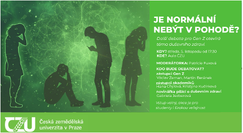 Ve středu 5. listopadu v 17:30 proběhla v Aule ČZU debata na velké téma: duševní zdraví. Do debaty byly jako zástupci akademiků vybrány Ing. Kristýna Kučírková, MSc., a PhDr. Hana Chýlová, Ph.D., a účastnil se kromě pozvaných hostů také současný rektor prof. PhDr. Michal Lošťák, Ph.D., který nad debatou převzal záštitu. Akce je iniciativou politologa Mgr. Milana Školníka, Ph.D., a je součástí série setkání, které jsou otevřeny studentům i široké veřejnosti. Více o debatě a jejích hostech naleznete zde: