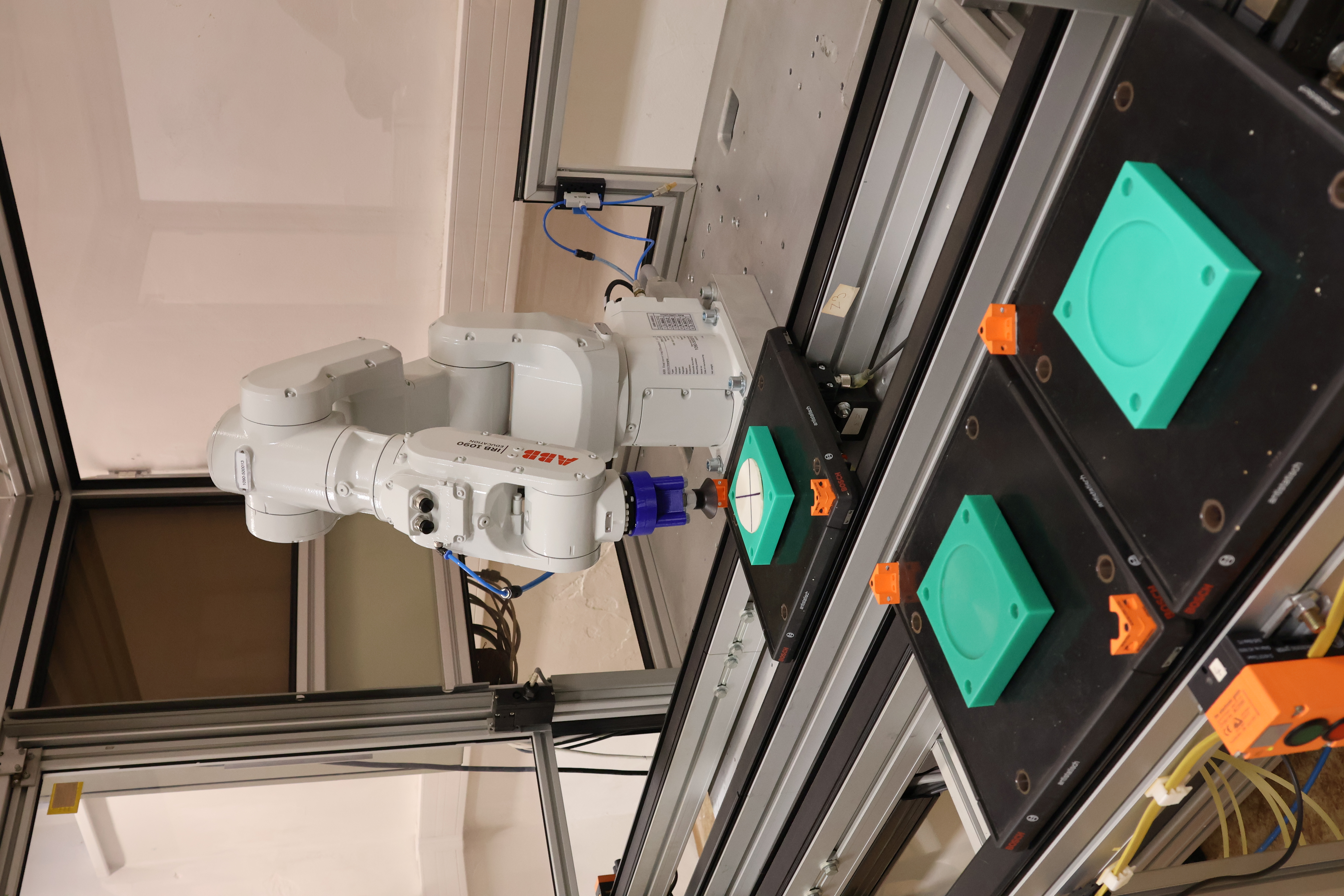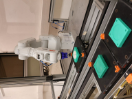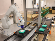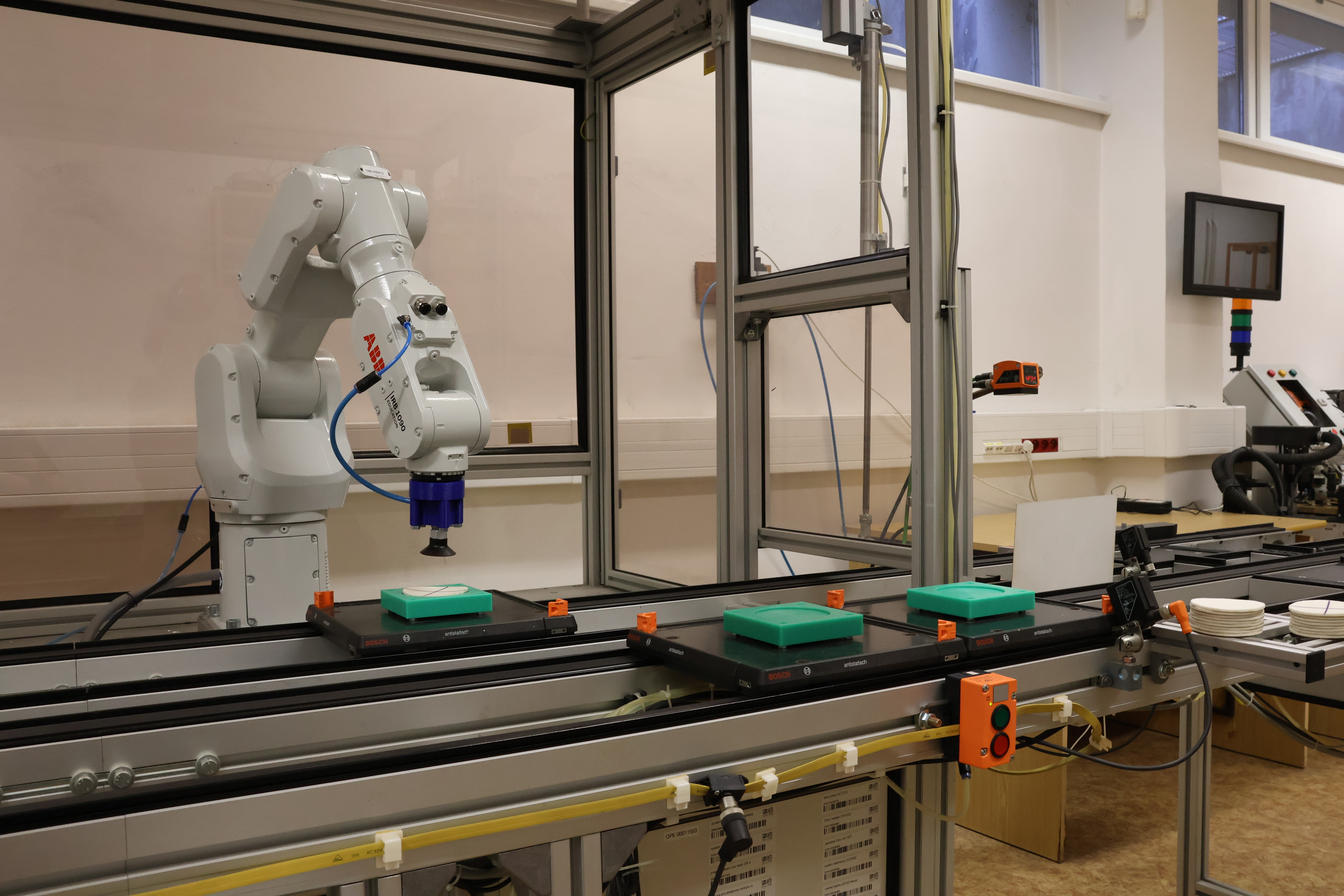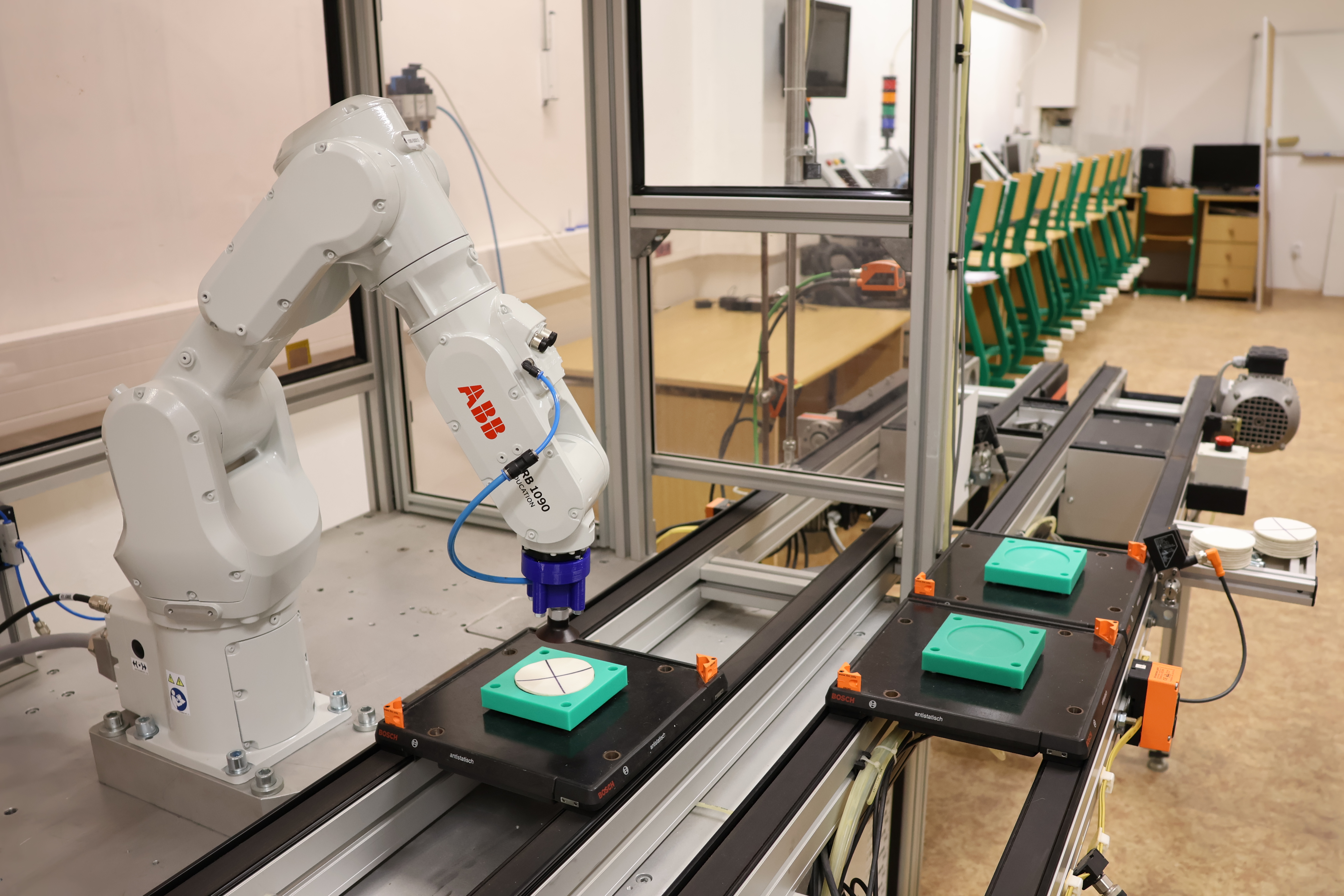 Průmyslový robot IRB 1090 od společnosti ABB je integrován do modelu průmyslové linky, která demonstruje skutečný průmyslový systém, včetně vybavení rozhraním pro komunikaci s dalšími řídicími systémy.